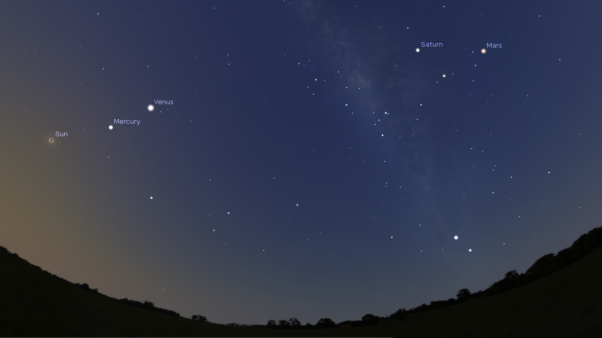 Merkurius akan terlihat di langit timur dan berada paling dekat dengan Matahari. Jika kita nanti menghadap ke arah timur maka akan terlihat Merkurius berada di atas Matahari. Besar sudut elongasi antara Matahari dan Merkurius sekitar 13 derajat. Merkurius akan terlihat sebagai bintang putih terang. Magnitudonya mencapai 0,2 atau hampir sama terang dengan Bintang Vega di Rasi Lyra.Venus di Langit Timur